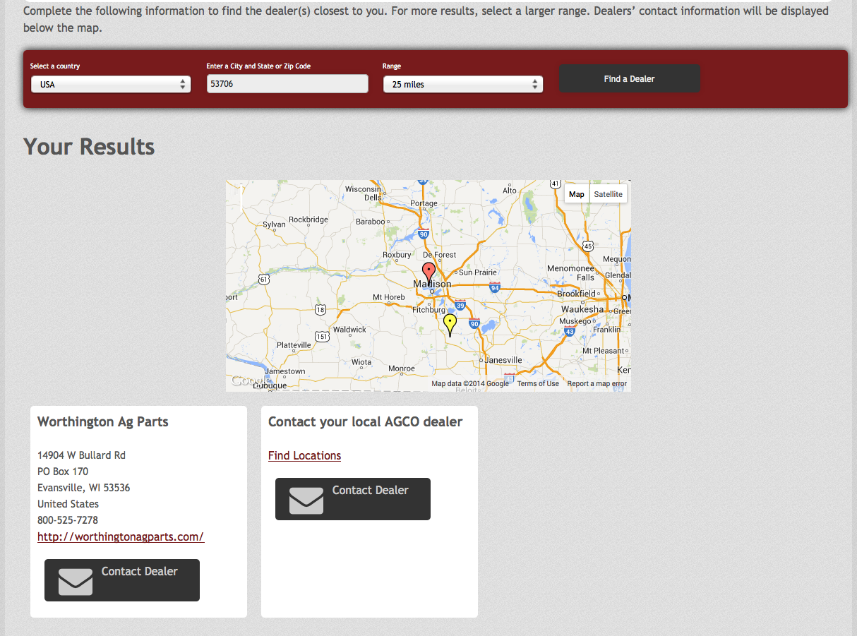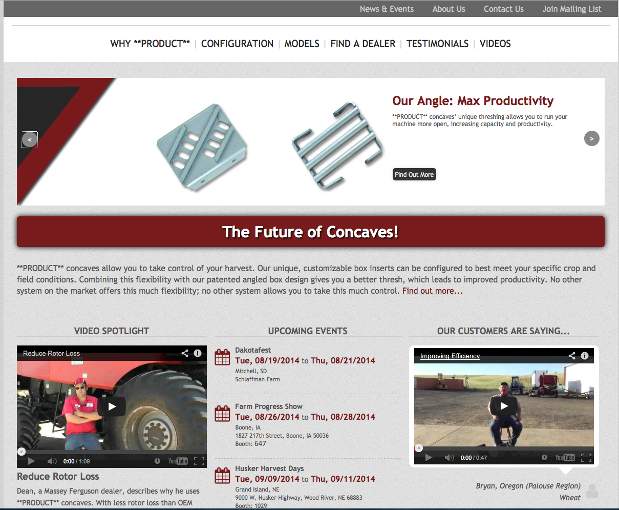 The agricultural marketing website was a custom website done using Drupal 7. Features included a completely custom, responsive theme, dealer finder and custom configuration guide. It was written using Drupal 7 and Google Maps integration. Custom modules were written to add a dealer finder and configuration guide. Additionally, the views module was used extensively for various content filtering. Youtube integration was added for video nodes.