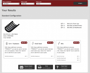 The configuration finder is a custom Drupal module written to allow a customer to select the proper parts for their combine. It includes a link to the dealer finder as well as multiple custom node types to facilitate easy end-user configuration creation.