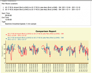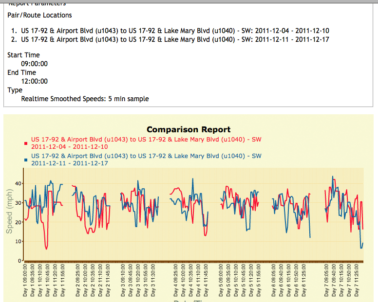 Visualization of traffic speed over multiple periods of time in the same graph and/or report to see quick comparisons between two different roads or the same road at different periods of time.