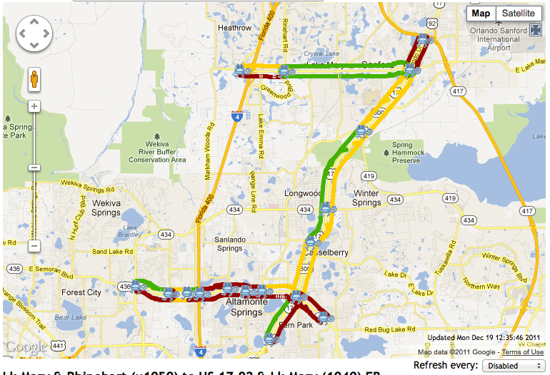 Using Google Maps, we are able to display our data in a quick and easy fashion that can be used by DOTs to quickly see road performance. Auto-refresh and full screen mode are both supported, allowing the customer to put the map on a large screen and quickly reference it at any time