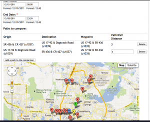 Allows a DOT to compare performance and car-counts over various sections of roadway in a few clicks. The traditional method of carrying out one of these studies is to send out post cards and hope for responses to gather data about 1 day of travel performance. Our system allows the customer to deploy devices and get thousands times more information with very little data processing time.