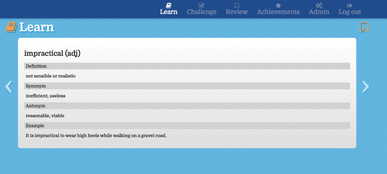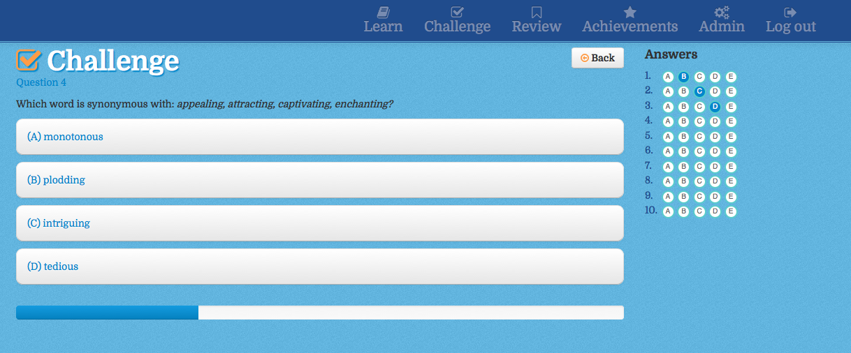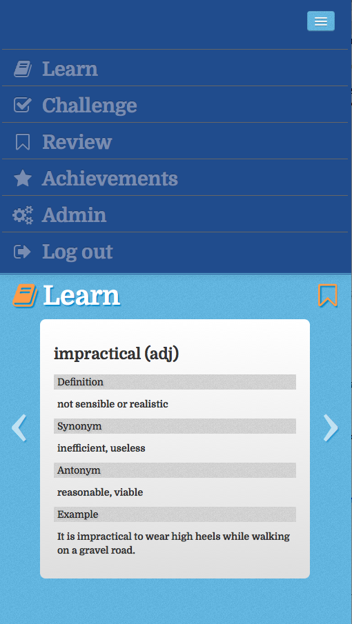 The Vocabulary Challenge application is a mobile web application written for a midwest based SAT/ACT test preparation company. It includes a responsive front-end which helps the student learn different SAT/ACT vocabulary terms through term review, challenge questions and achievements.